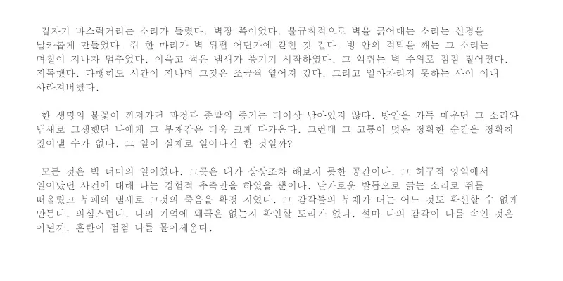 One day, I heard a scratching noise coming from the closet. It seemed that a mouse had fallen in somehow, and was trapped inside the walls. After a few days, the desperate scratching that made me so nervous had stopped. Time passed and I forgot all about the scratching, but then I began to smell something putrid. The mouse must have died, trapped inside the walls. The stench grew thicker and thicker for a week or two before suddenly dissipating. All the noise and stink that had invaded my personal space had subsided, finally. I found it interesting that I did not perceive its absence initially. When I realized the smell was gone, it somehow made me feel a little strange that there was no substantial evidence left, even though the intruder had been invisible and intangible from the beginning. In spite of that, I could sense that the spark of life had been extinguished after all the sounds of struggling, and death left its trace in the form of an unmistakable stench. The fact that even this fragment of evidence was gone soon after made me feel something deeper than simple acknowledgement of the absence of what was once present. Did any of this really happen?